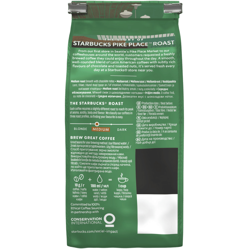 Pike Place Roast е създадено в чест на първия магазин на Starbucks в Сиатъл и е идеално за приготвяне във френска преса, кафеварка или еспресо машина.