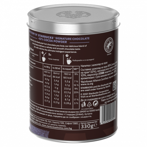 - Създаден от 100% какаови зърна с устойчив произход,сертифицирани от Rainforest Alliance Запознайте се с нашия STARBUCKS® Signature Chocolate 42% какао на прах, внимателно създаден, висококачествен продукт, който може да си проготвите у дома.