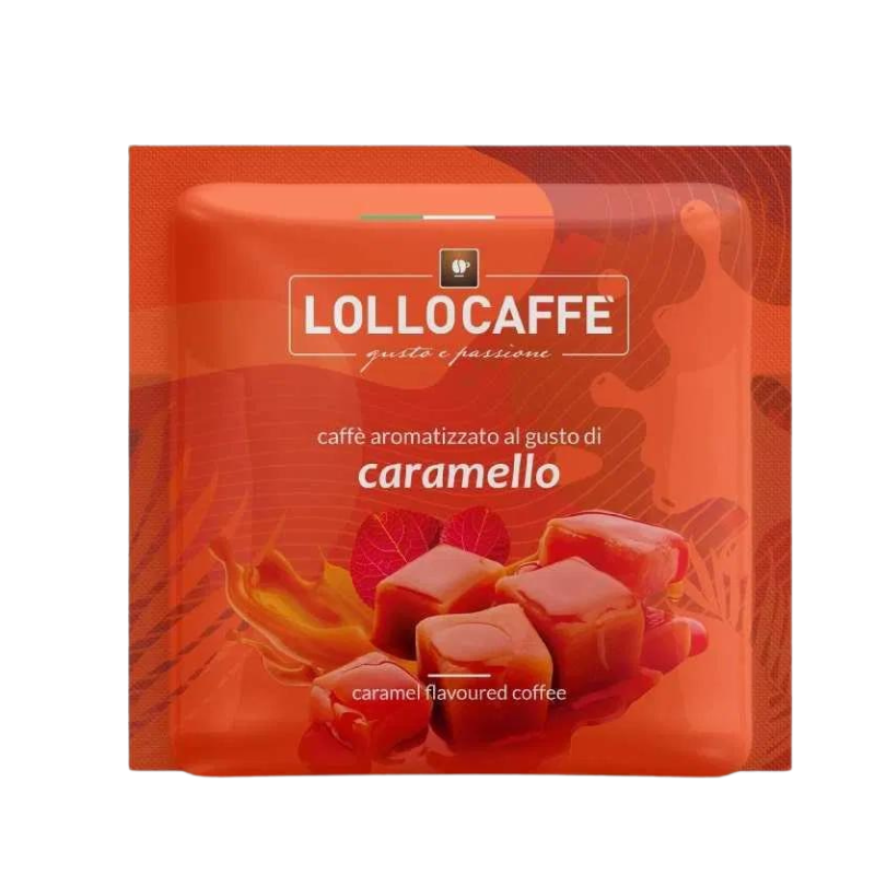 Lollocaffee CARAMELO - е кафе с аромат на карамел. Хартиена доза кафе съвместима с E.S.E. кафемашини с деликатната нотка на карамел, съчетана с топлия аромат на еспресо.