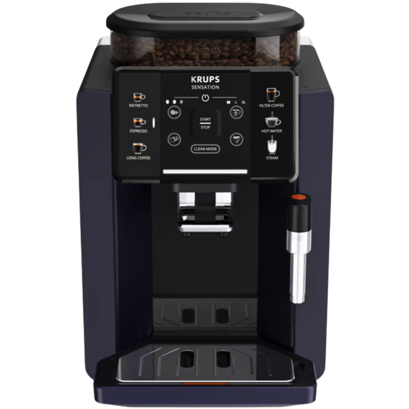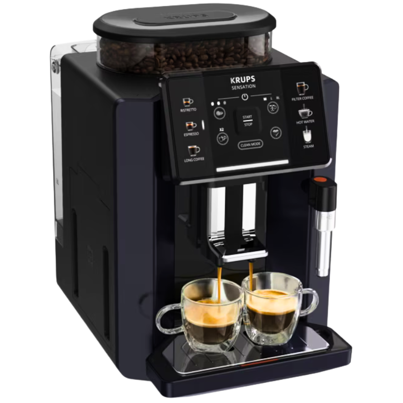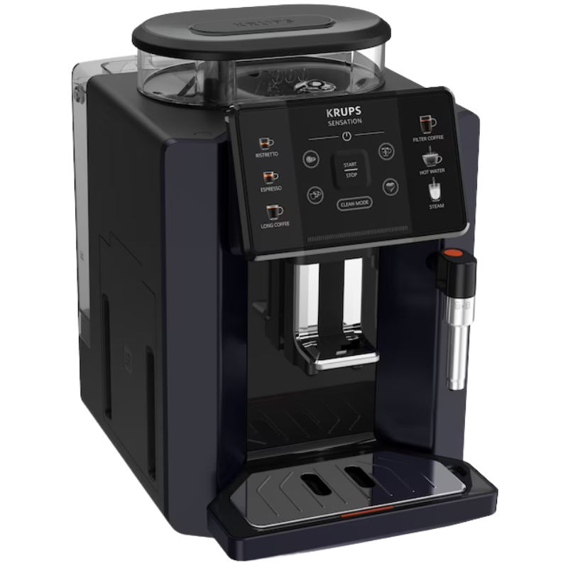 Krups Sensation EA910B10 комбинира модерен дизайн и интуитивно управление. Чрез сензорния екран избираш желаната напитка само с едно докосване – от класическо еспресо до по-дълго кафе.