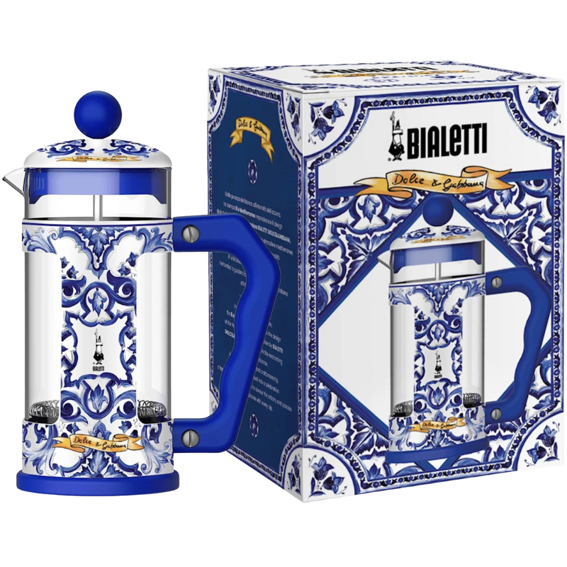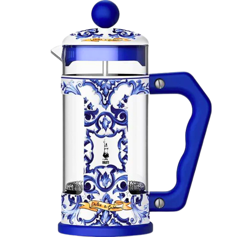 Dolce&Gabbana Bialetti – синя френска преса съчетава емблематичния дизайнерски стил с удобството на класическата French press технология. С елегантен син дизайн и детайли, вдъхновени от италианската традиция, тази преса е едновременно практичен уред и впечатляващ акцент в кухнята.