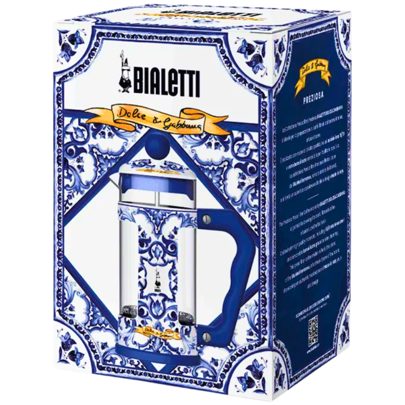 Синята френска преса Dolce&Gabbana Bialetti е създадена за тези, които искат не просто кафе, а преживяване. Стъкленият корпус ви позволява да наблюдавате процеса на екстракция, а металният бутален филтър запазва плътния вкус на кафето. Подходяща е за сутрешно кафе, споделено с близки, както и за стилна презентация при гости.
